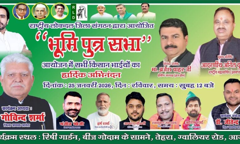 आगरा : 25- जनवरी 2026 को राष्ट्रीय लोकदल के जिला संगठन द्वारा गाँव तेहरा ग्वालियर रोड आगरा मे “ भूमि पुत्र सभा “ का आयोजन किया गया । जिस में लोकदल के राष्ट्रीय महासचिव व प्रवक्ता अनिल दुबे मुख्य अतिथि के रूप में उपस्थित रहे । विशिष्ट अतिथि के रूप में बृज क्षेत्र के अध्यक्ष श्री बृजेश चाहर जी उपस्थित रहे.